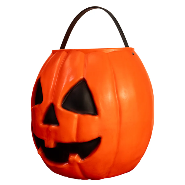 Crafted from durable blow mold plastic, this 9″ tall candy pail brings the classic Don Post Pumpkin Mask to life in retro style. This candy pail features painted details and a flexible plastic handle making it perfect for trick or treating.